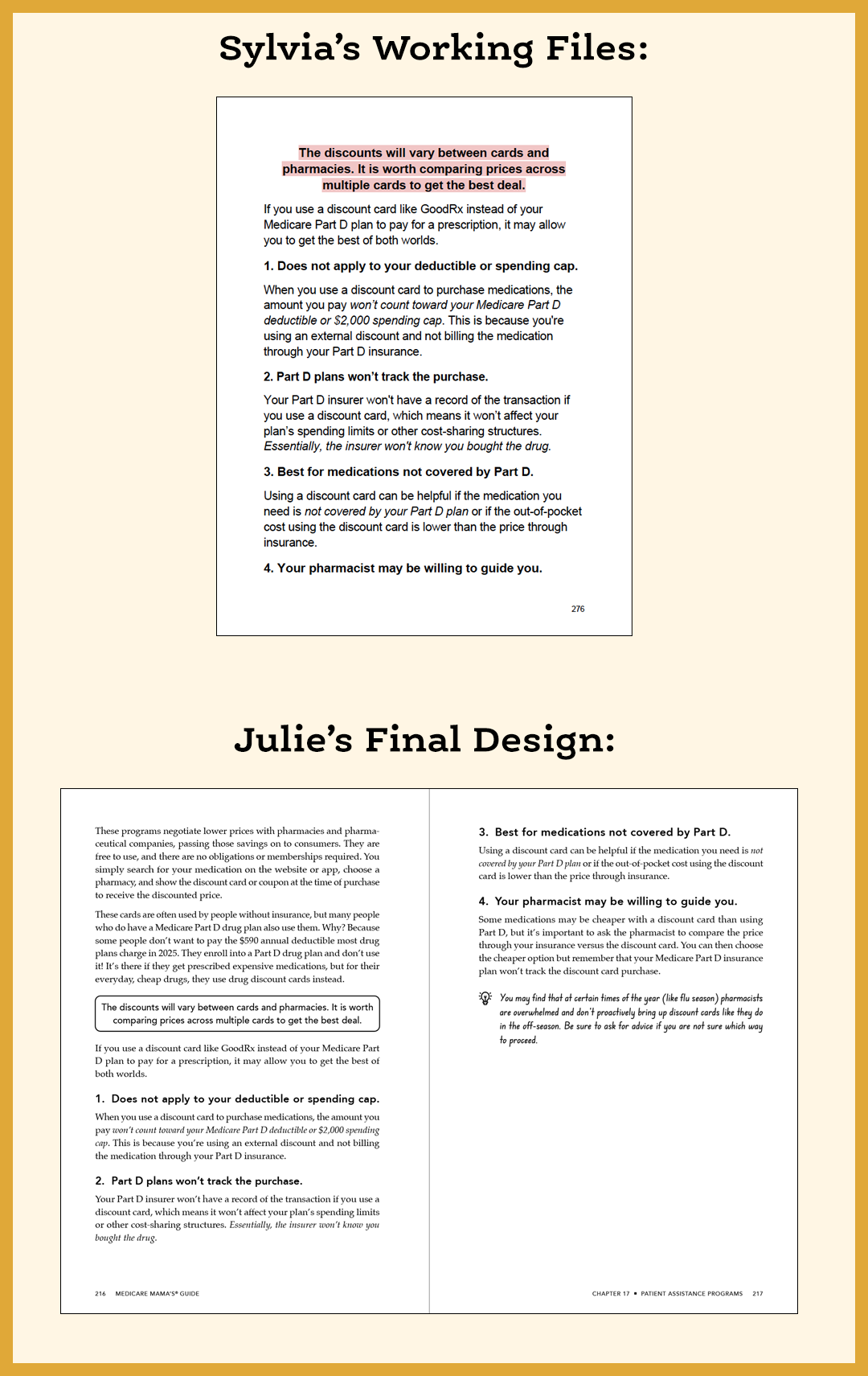 Medicare Mama's book could become dry with all the details she needed to include, so she asked me to make the layout more playful with lots of little icons or graphics (this worked well for her social media audience who were now reading her book), boxes and call-outs. —Julie