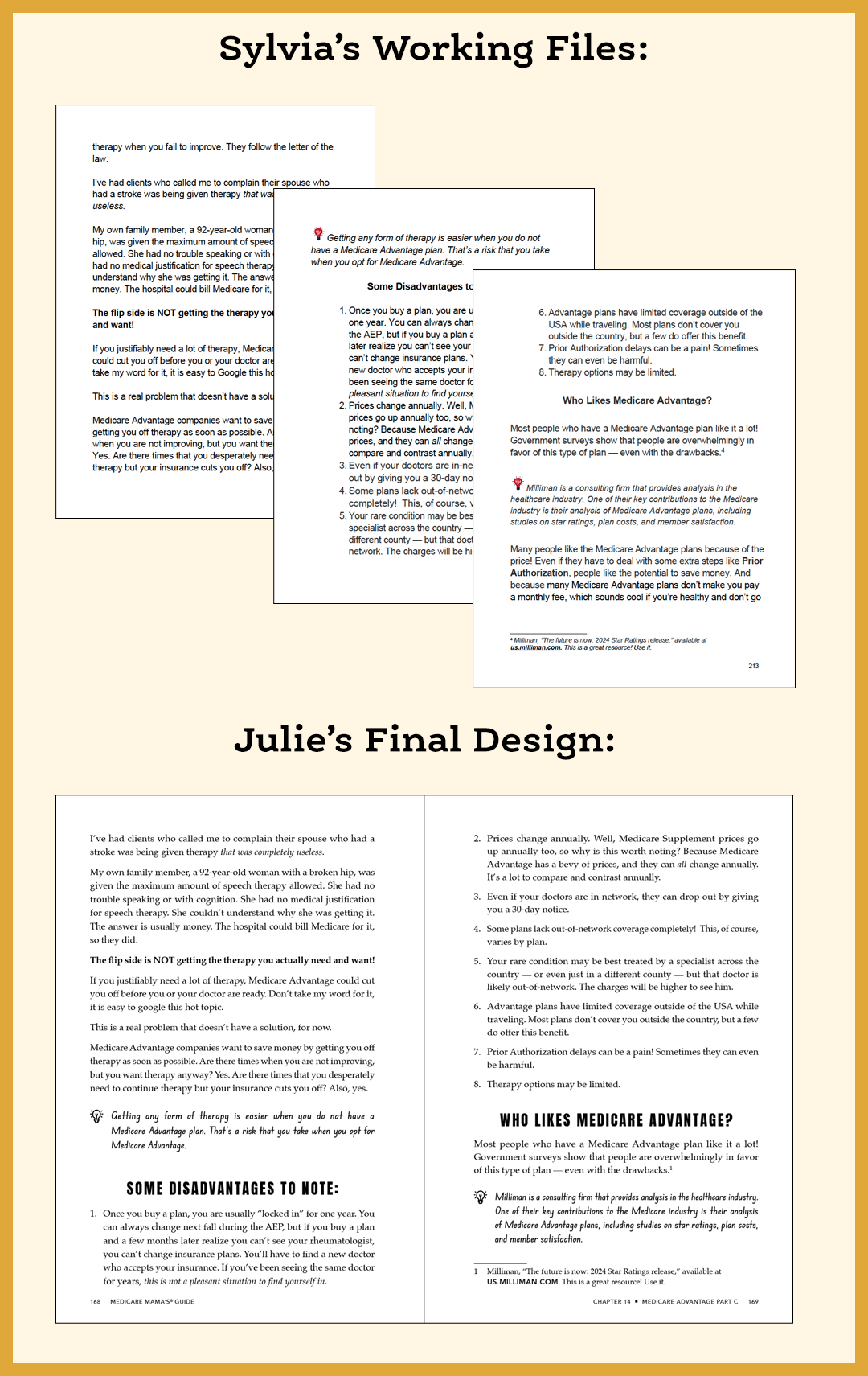 I worked with Sylvia Gordon on her first book, an almost 90,000-word book for Americans preparing for retirement and wanting to understand their options. Sylvia is known to many as “Medicare Mama”, with a 1M+ social media following built around explaining complex Medicare and retirement topics in a clear, approachable way. Her book grew directly out of years of questions from her audience and was designed to be practical, readable, and accessible despite containing a lot of dense information. We used a lot of graphics, boxes and special text styling to help the reader move through the book more easily!